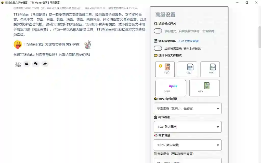 一款免费的文本转语音工具,提供语音合成服务,支持多种语言,包括中文、英语、日语、韩语、法语、德语、西班牙语、阿拉伯语等50多种语言,以及超过300种语音风格。您可以用它制作视频配音,也可用于有声书朗读,或下载音频文件用于商业用途(完全免费)。作为一款优秀的AI配音工具,TTSMaker可以轻松地将文本转换为语音。文字转语音工具。