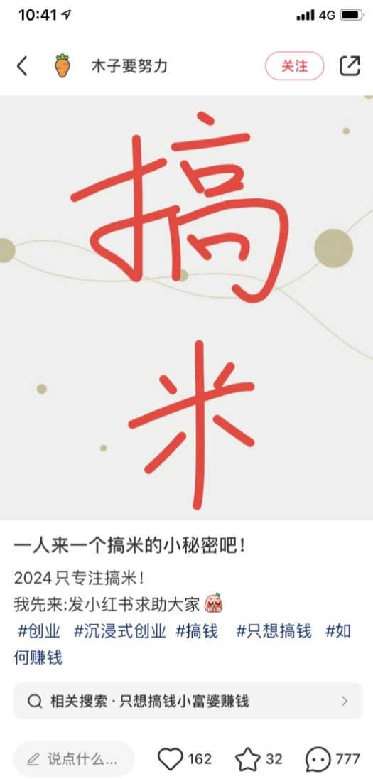 兼职粉的模板属于最为简单、易做的那种,毕竟满屏皆是谈钱、搞钱、暴富之类的,随便在小红书上搜索这些关键词,都能发现众多爆文。