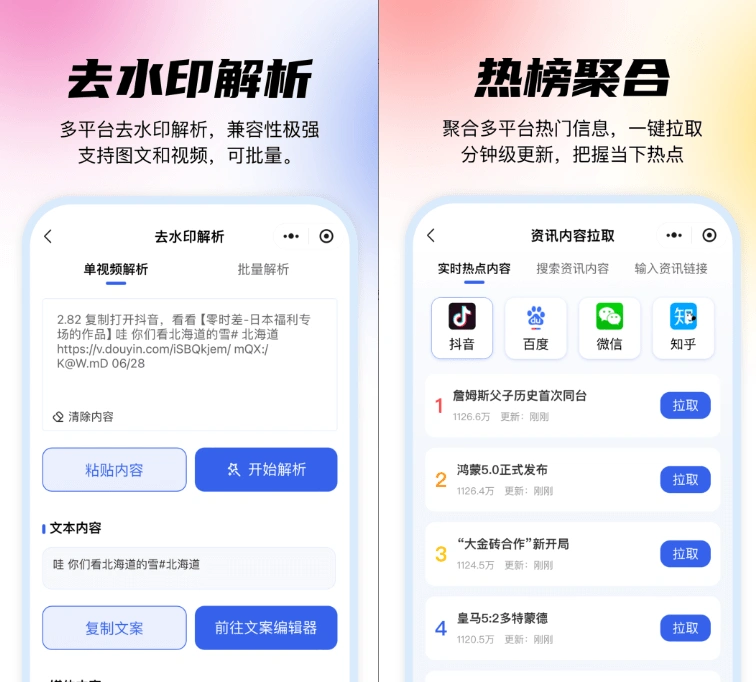 短视频创作者的一站式服务平台。提供: 1、创作工具:视频二创、Ai配音、文案提取 等; 2、数据服务:素材搜索、文案搜索、数据推荐等; 3、热门工具:字幕移除、资讯拉取、图片处理等;目前这款工具已上架多个平台,今天测试了一下,发现是免费的,所以来给大家分享一下。